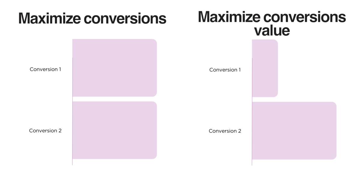A simplified model illustrates the difference between the “Maximize Conversions” and “Maximize Conversion Value” bid strategies. In the first example, the ad algorithm sees both conversions as equal. However, in the second example, the conversions carry different weights, and this can significantly influence future bidding decisions.