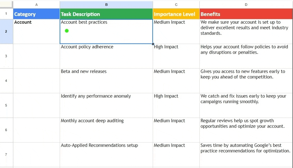 Our client optimization tables give an overview of the work we do for our clients’ accounts. We’ve updated the tables to a vertical format and added a new “Benefits” column that explains the value of each task. With dozens of ongoing tasks being performed, it can be challenging for the non-savvy to understand their purpose, and this new column helps enhance our transparency with clients.